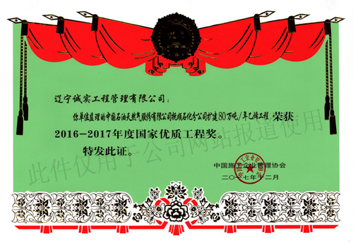 2017年11月10日,根據中施企協(xié)字【2017】66號文件——《關于表彰2016-2017年度國家優(yōu)質工程獎的決定》公告,我單位所監(jiān)理的“中國石油天然氣股份有限公司撫順石化分公司擴建80萬噸/年乙烯工程”榮獲2016-2017年度國家優(yōu)質工程獎,該項目總監(jiān)“任潤東”還獲得了“2016-2017年度第二批國家優(yōu)質工程獎突出貢獻者”的榮譽稱號。